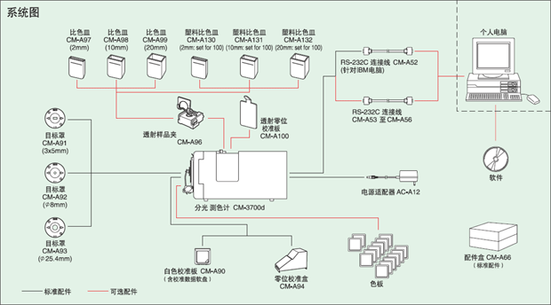 可選配件 | 透射樣品夾CM-A96,透射零位校正板CM-A100,比色皿CM-A97、98、99,塑料比色皿CM-A130、131、132 色彩管理軟件CM-S100w |