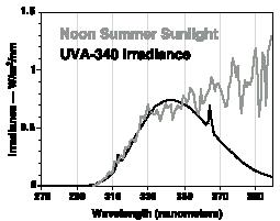 對于不同的應用條件,需要不同光譜進而需要不同類型的燈管。UVA-340燈管對太陽光的紫外短波段模擬效果好。UVA-340的光譜能量分布(SPD)在太陽光的截止點到大約360 nm范圍內(nèi)與太陽光譜吻合的非常好。